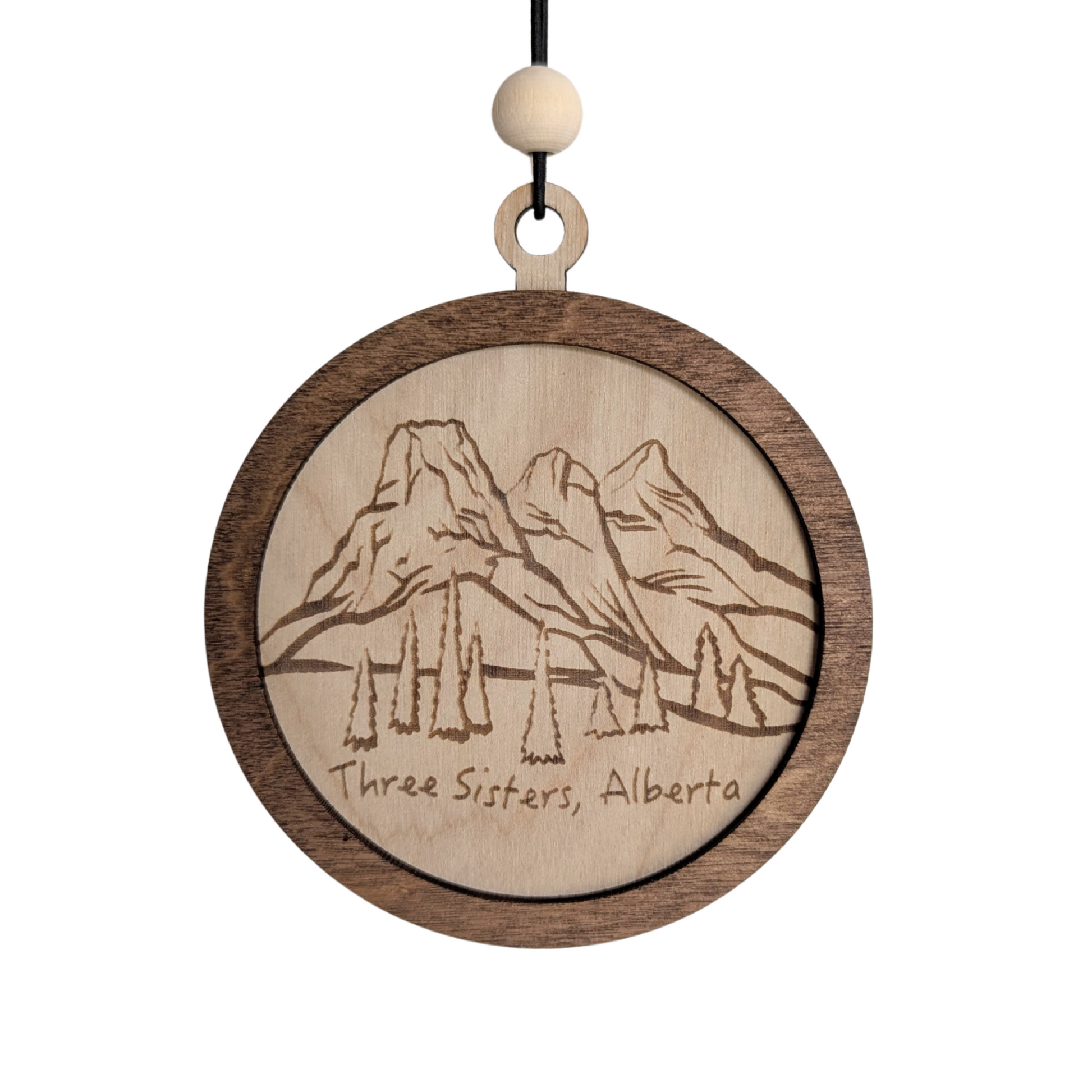 Crafted from 1/8" wood with an engraved sketch of the Three Sisters Mountain Range in Alberta, and a stained wood accent ring.